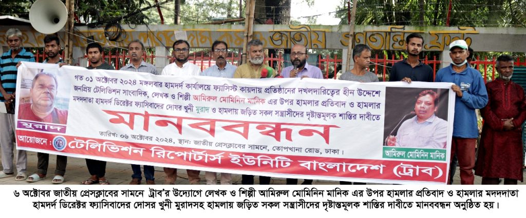 স্টফ রিপোর্টার: ৬ অক্টোবর রবিবার বিকাল ৩টায় জাতীয় প্রেসক্লাবের সামনে টেলিভিশন রিপোর্টার্স ইউনিটি বাংলাদেশ (ট্রাব) এর উদ্যোগে গত ০১ অক্টোবর হামদর্দ কার্যালয়ে ফ্যাসিস্ট কায়দায় প্রতিষ্ঠানের দখলদারিত্বের হীন উদ্দেশ্যে জনপ্রিয় টেলিভিশন সাংবাদিক, লেখক ও শিল্পী আমিরুল মোমিনিন মানিক এর উপর হামলার প্রতিবাদ ও হামলার মদদদাতা হামদর্দ ডিরেক্টর ফ্যাসিবাদের দোসর খুনী মুরাদসহ হামলায় জড়িত সকল সন্ত্রাসীদের দৃষ্টান্তমূলক শাস্তির দাবীতে মানববন্ধন অনুষ্ঠিত হয়।