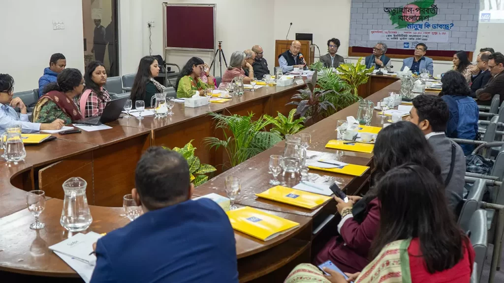 বৃহস্পতিবার (১২ ডিসেম্বর) প্রেস ইনস্টিটিউট বাংলাদেশ (পিআইবি)-তে ‘অভ্যুত্থান-পরবর্তী বাংলাদেশ: মানুষ কি ভাবছে’ শীর্ষক আলোচনা সভায় জরিপের ফলাফল উপস্থাপন করা হয়। এই সভায় জরিপে প্রাপ্ত ফলাফলের ভিত্তিতে বিভিন্ন বিষয়ে জনগণের আশা, উদ্বেগ এবং দেশের ভবিষ্যৎ সম্পর্কে তাদের চিন্তাভাবনা নিয়ে আলোচকবৃন্দ আলোচনা করেন।